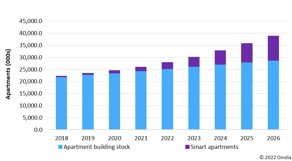 According to the latest smart apartment report from Omdia, in 2021 there were an estimated 1.6 million smart apartment units in the US, representing approximately 6.6% of the multifamily apartment building stock. In 2026, the number of smart apartment units is expected to reach nearly 10 million, equating to 34% of the apartment building stock. In terms of in-unit IoT devices in the US, there were approximately 4 million new devices installed (shipped) in smart apartments in 2021, increasing to approximately 18 million devices in 2026.