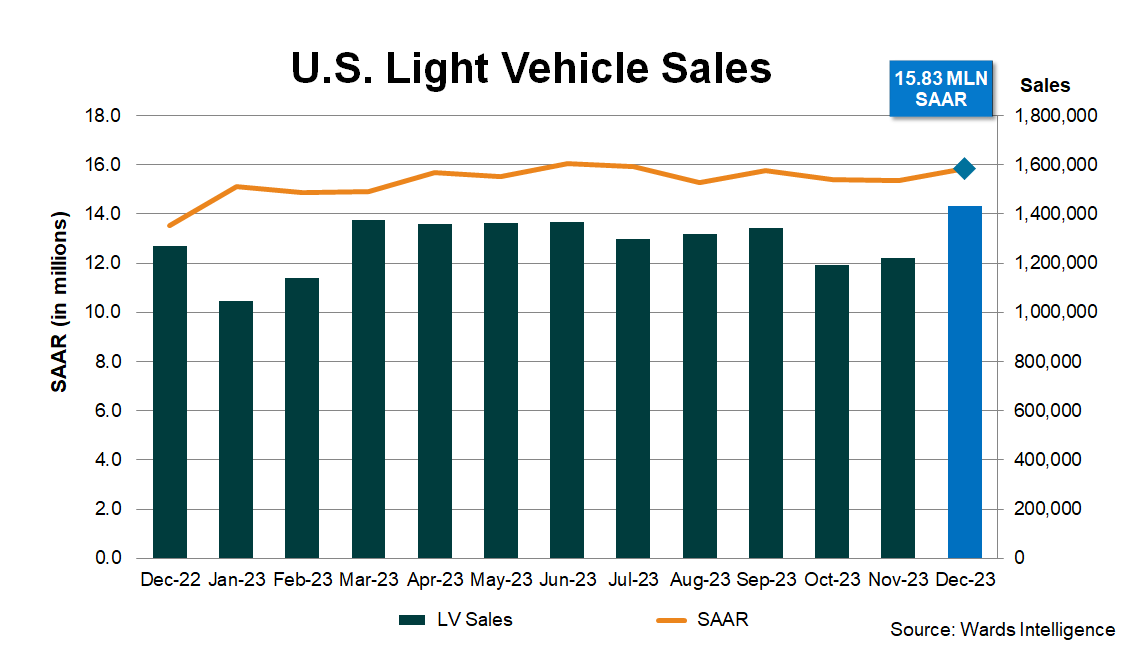 U.S. light-vehicle sales ended 2023 with December results slightly higher than expected, as increased availability, more discounting and a rebound in fleet deliveries lifted the seasonally adjusted annual rate to 15.8 million units.